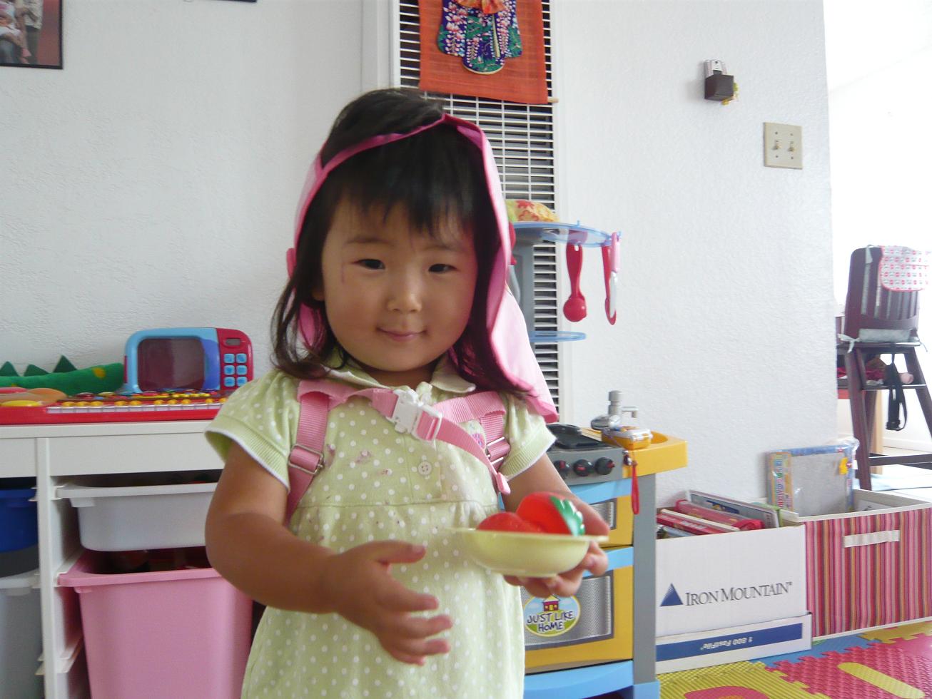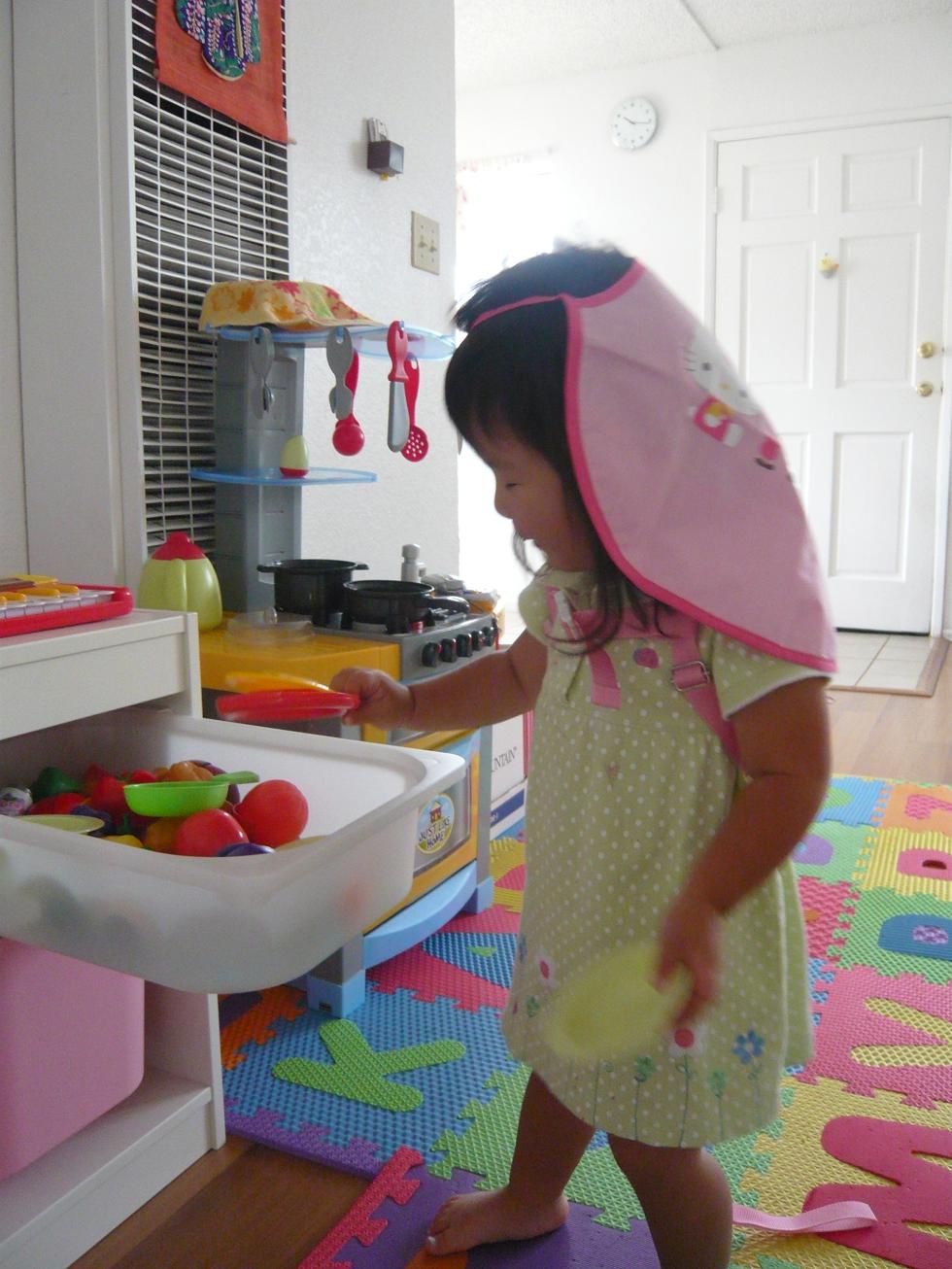 お誕生日プレゼントのキッチンセットで遊ぶのが相変わらず好きなヒメ。