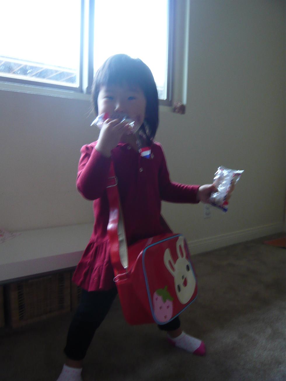 朝ごはんの間もずっと肩から掛け、「幼稚園に行く~」と大騒ぎ。