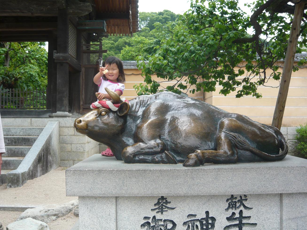 「御神牛」と写真を撮るときも、参道の赤い橋を渡るときも握り締めたまま。