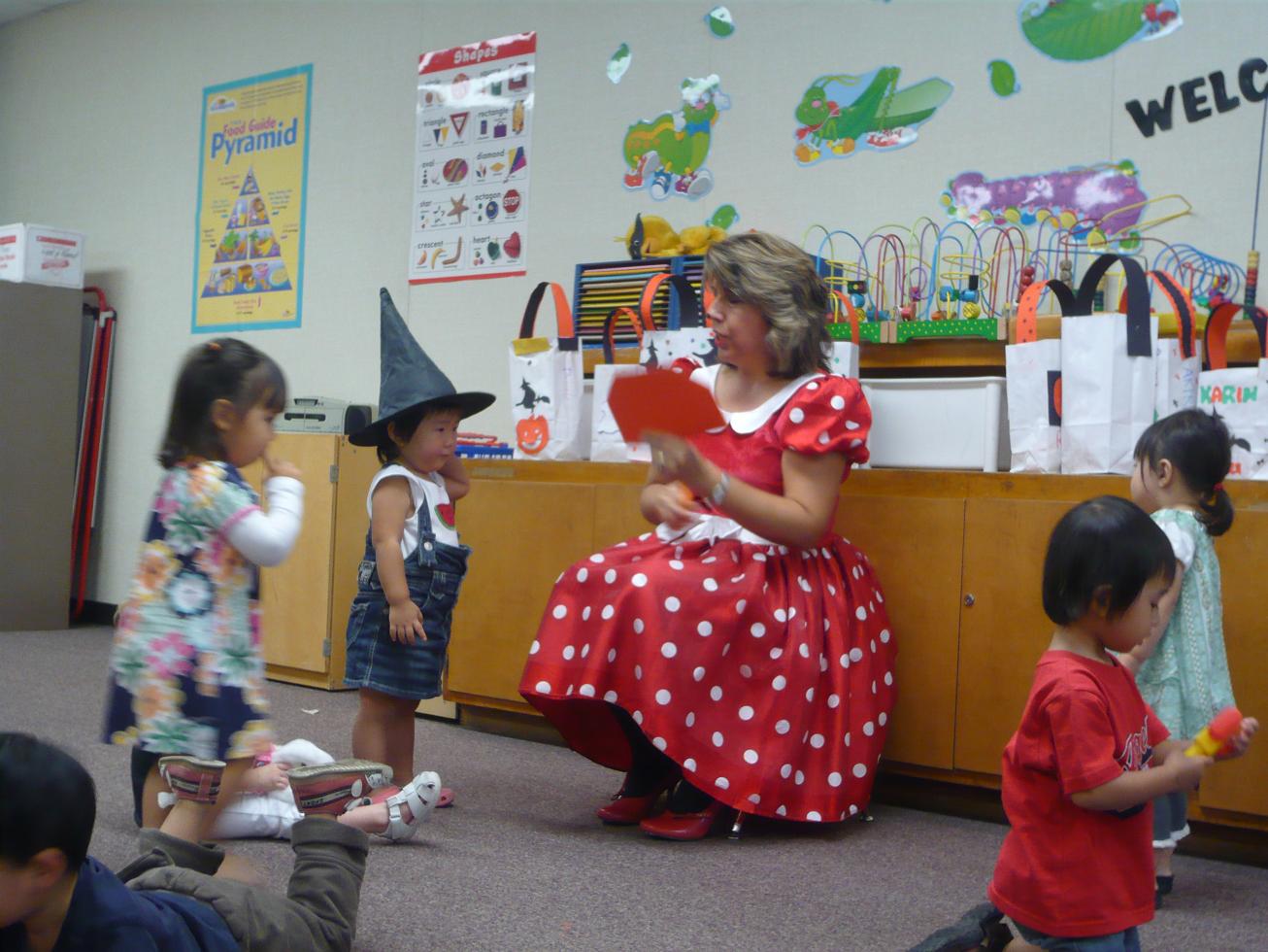 みんながミニーちゃんに変身した先生と楽しそうに写真を撮っている、その横で
