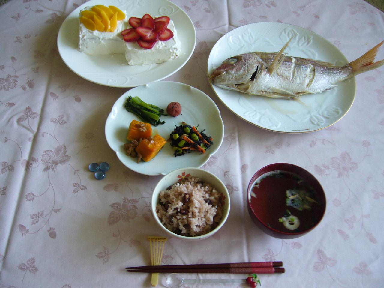 お赤飯、お吸い物、鯛の尾頭付き、煮物に香の物が定番らしい。