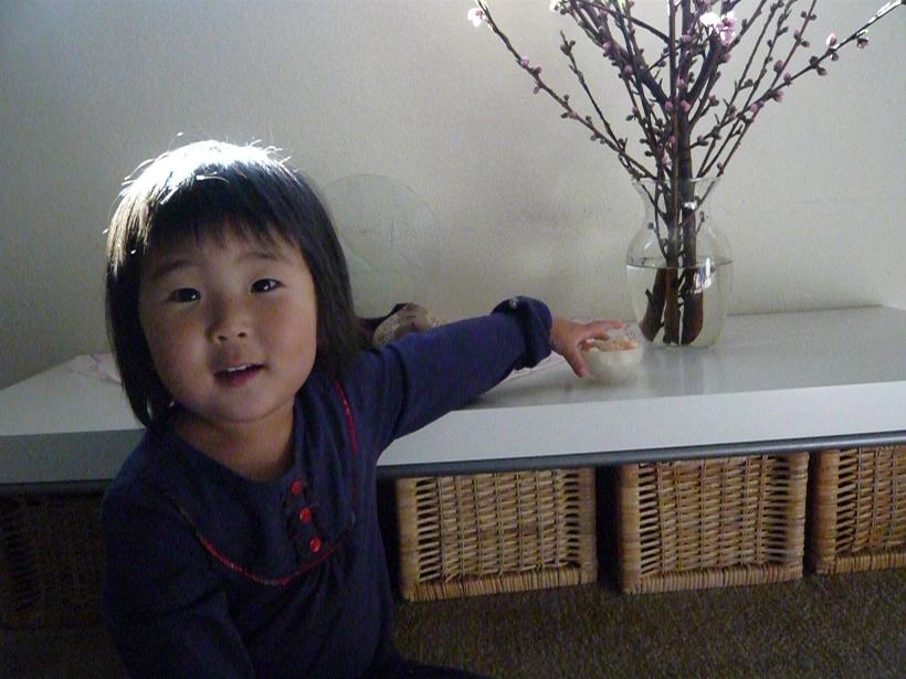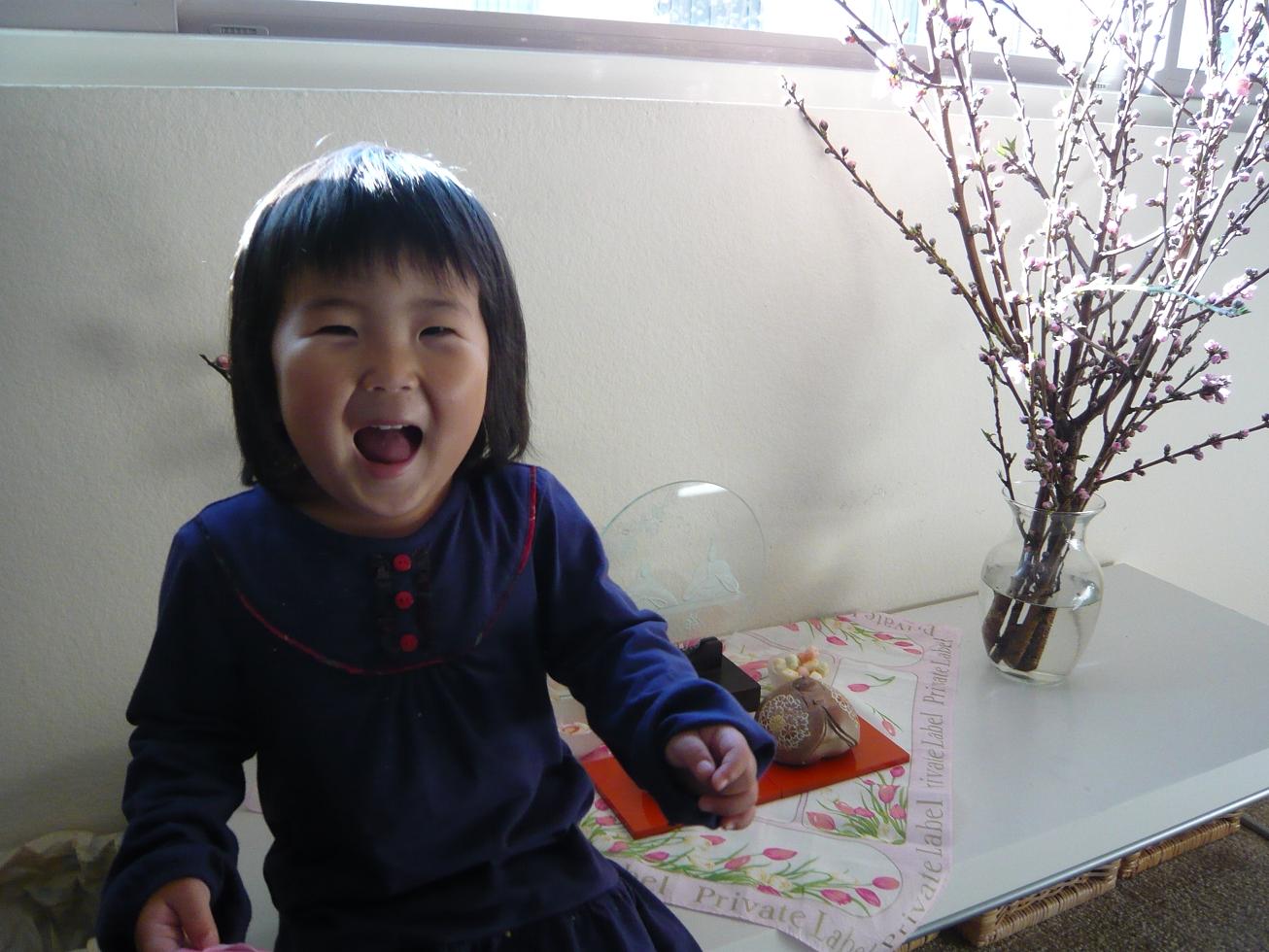 次の瞬間にはひなあられに手を伸ばし、ピンクばかり狙ってパクパク・・・。