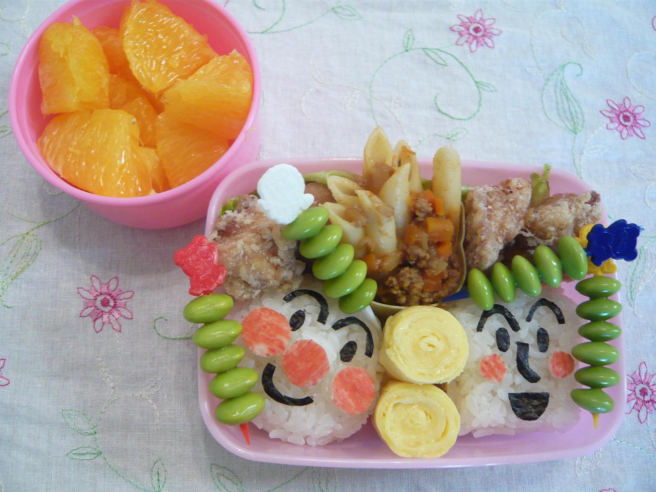 月曜日のお弁当。今日のおにぎりはアンパンマンとしょくぱんまんコンビ。