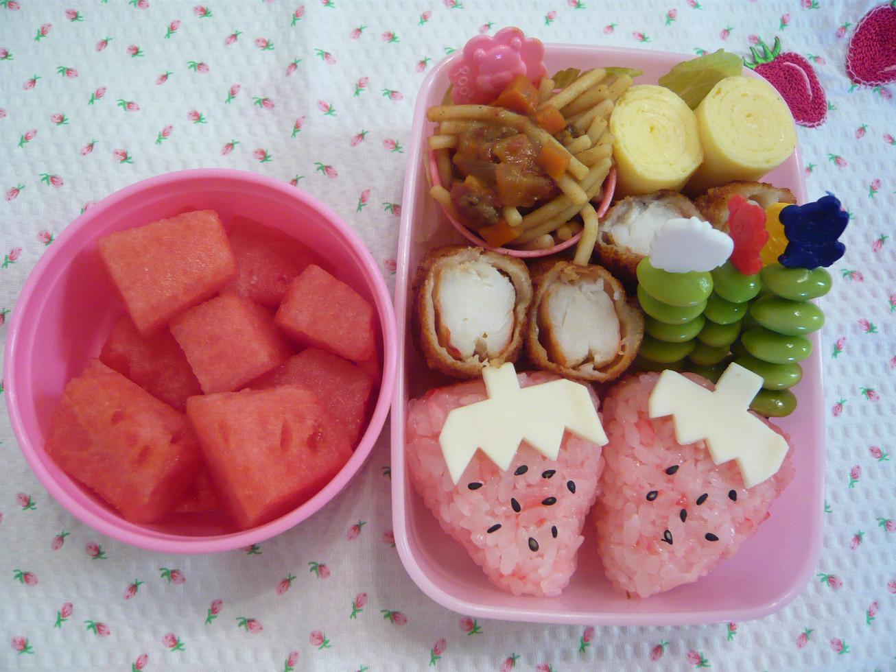 金曜日のお弁当。「イチゴがいい!」とのリクエストに応えて、イチゴおにぎり。