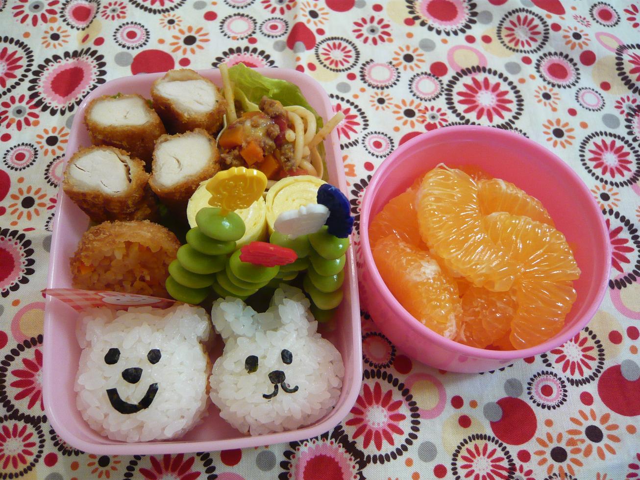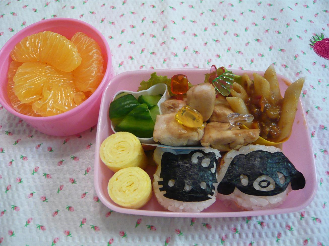 水曜日のお弁当。果物はヒメのリクエストに応えて みかん。(オレンジと言うべき?)