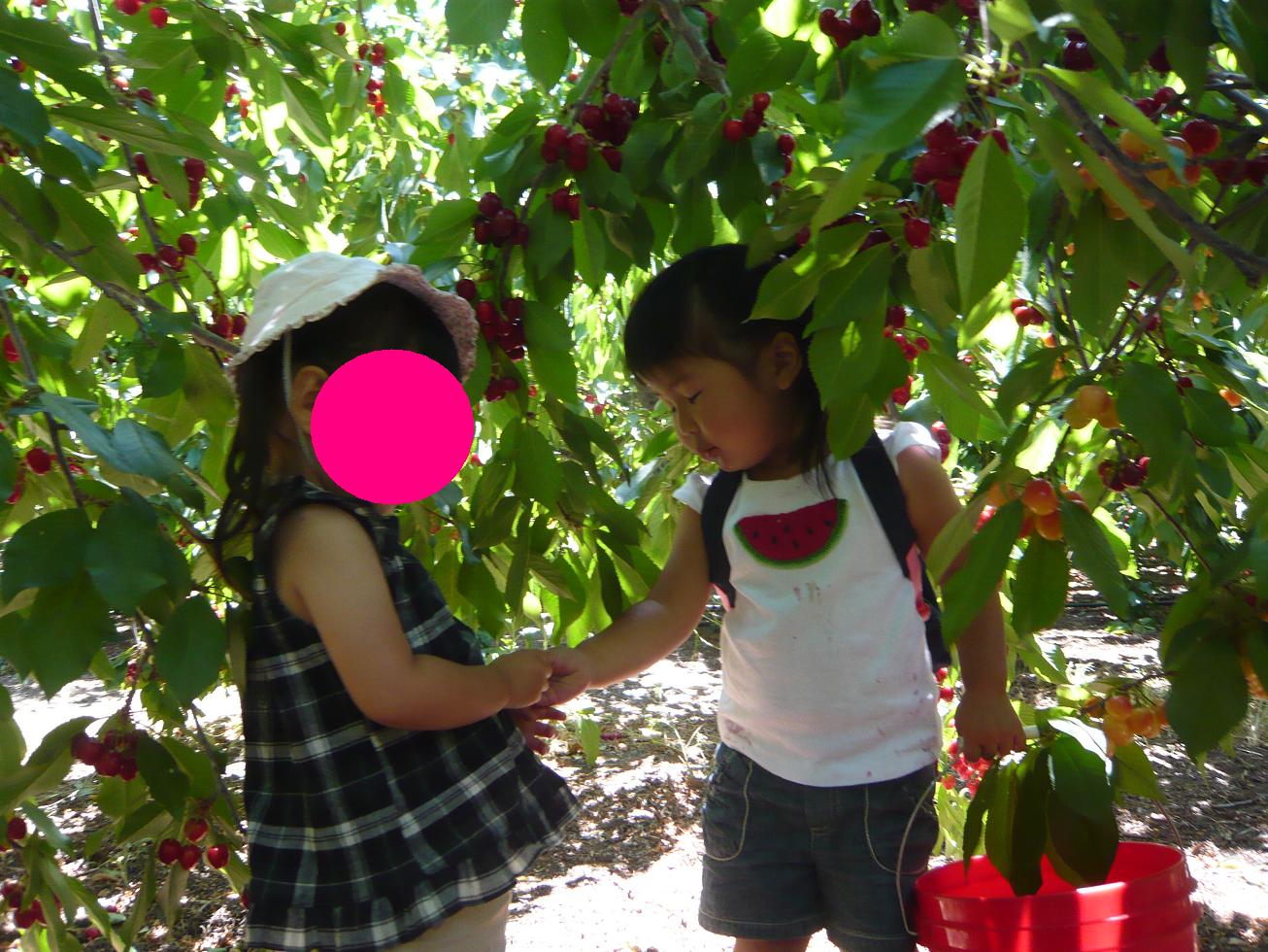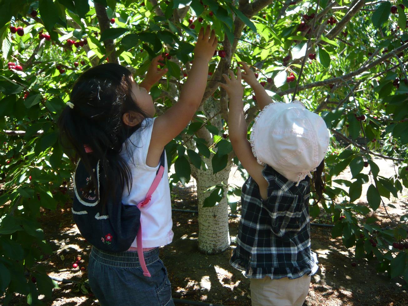 それでも「はい、これ」とお互いにさくらんぼを取ってあげたり、同じ木に二人で仲良く