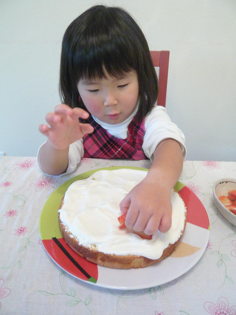 で、何とか手にできたイチゴを、前日焼いておいたスポンジにはさむ作業をヒメにお任せ。